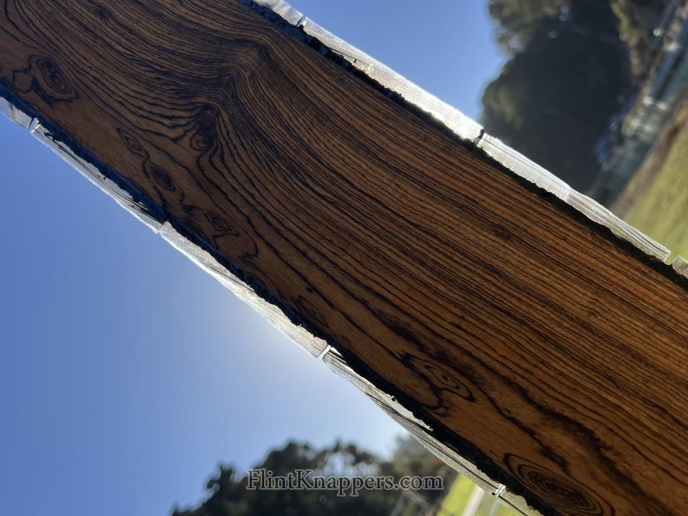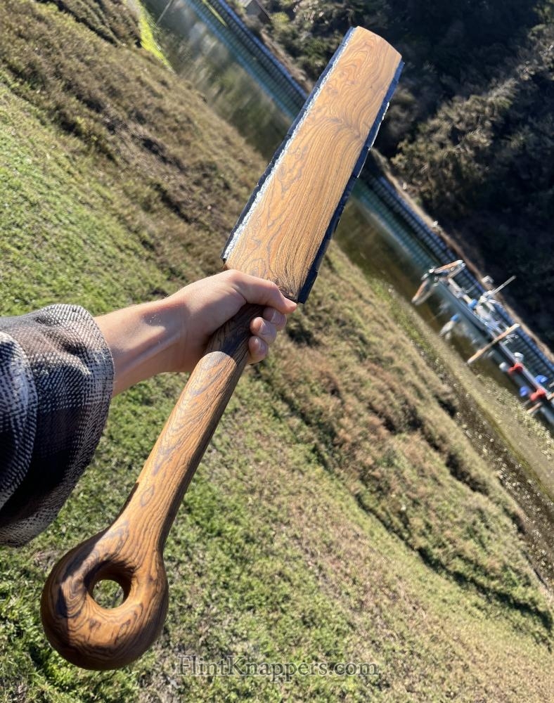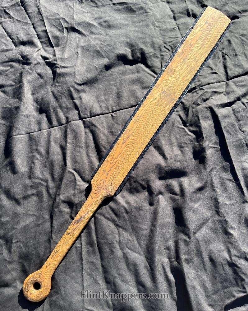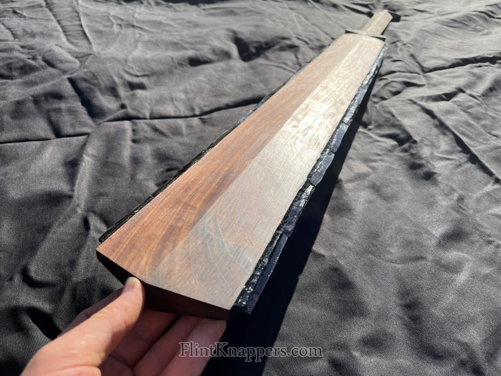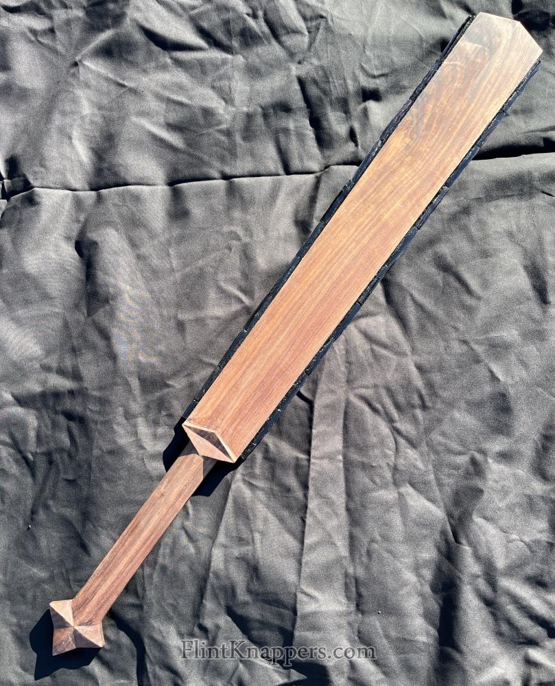 Macuahuitl made from bocote wood with obsidian prismatic blades. The wood was finished using stone tools to give an accurate polish to the originals, and the blades were hafted with pine tar. I also used banded obsidian to match the grain in the wooded handle. |
