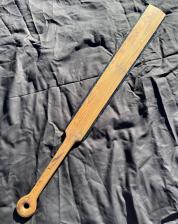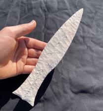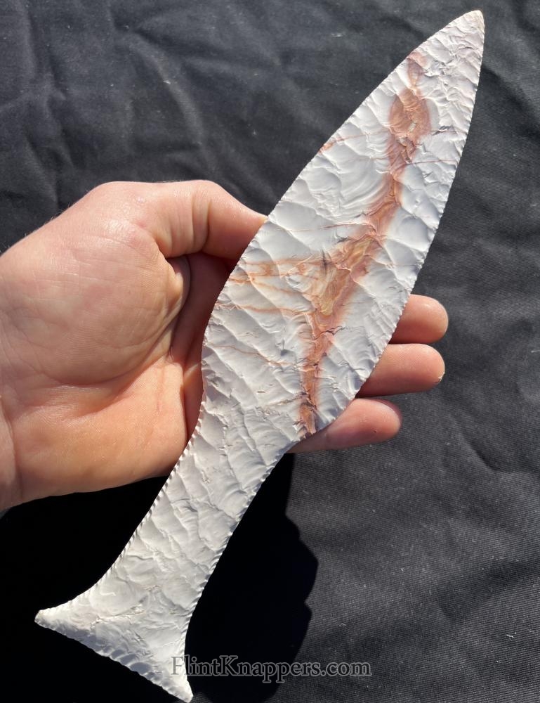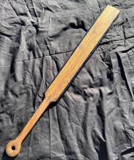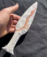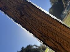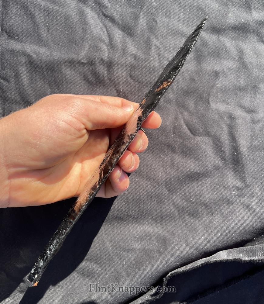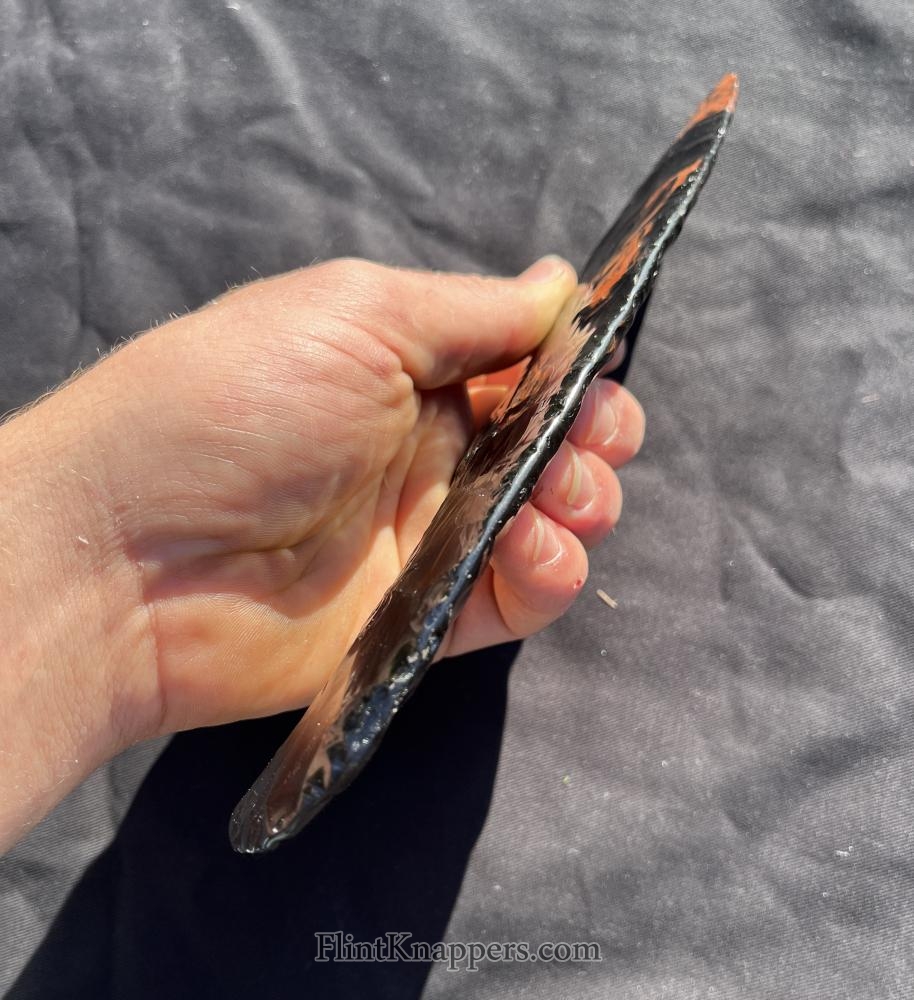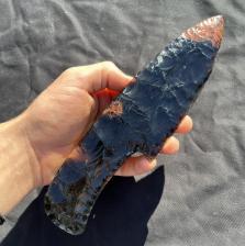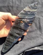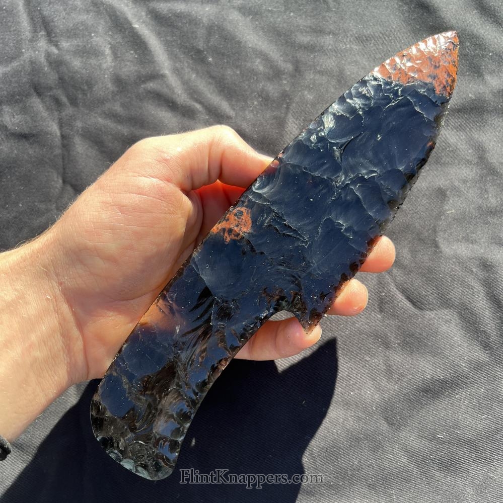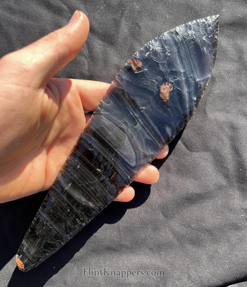Macuahuitl made from bocote wood with obsidian prismatic blades. The wood was finished using stone tools to give an accurate polish to the originals, and the blades were hafted with pine tar. I also used banded obsidian to match the grain in the wooded handle. |