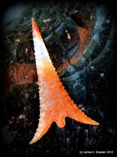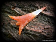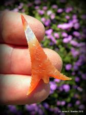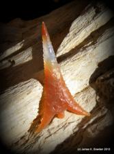 This multicolored arrowhead glows when back lit against the sun, and is stunning with the broad color bands that make it a unique piece.  Flintknapped by James Bowden, it holds his characteristic style with delicate serrations and long out swept wings and a needle like tip.