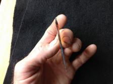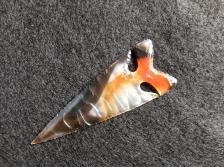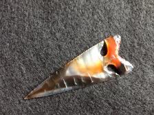 Brazilian Agate Point . Very thin piece with tight entry notches and beautiful coloring . The photos are deceiving , when held in hand the notches are VERY tight at less than 1/16th inch and the point is SUPER thin. High quality piece here . All my work is micro diamond scribed with my initials and date .