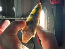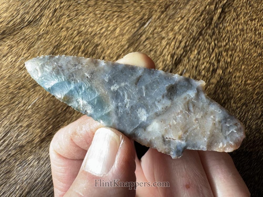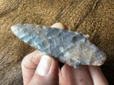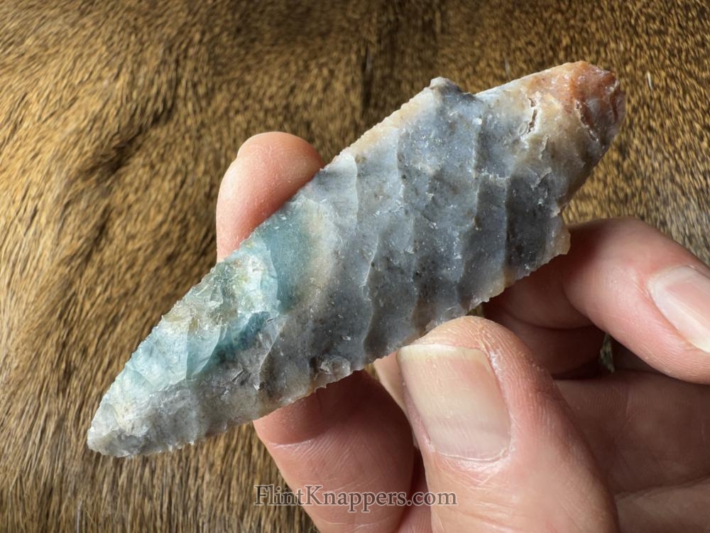 Made from beautiful Coastal Plains chert from Brier Creek! Unique colors with nice oblique pressure flaking and multiple crystal seams! Serrated sharp, thanks for looking! |