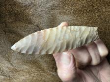 Made from beautiful semi translucent Coastal Plains chert from Brier Creek! Nice oblique flaking on this piece. Serrated sharp, hafting area is ground. Thanks for looking! |