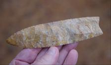 I believe this is Brier Creek, possibly Georgia Jasper. It is a very nice Paleo style Clovis, I am not 100% sure of the knapper on this one. Fully fluted clear to the tip on one side! Ships Free. |