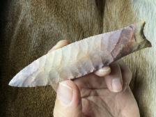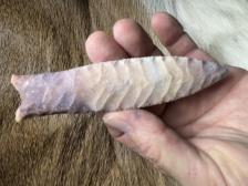 Beautiful, almost pastel colors in this unique piece of Coastal Plains chert from the Brier creek area! Nice chevron flaking pattern on this sleek Dalton style point. Hafting area is ground, serrated sharp, thanks for looking! |