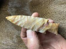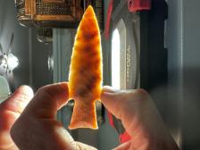 Beautiful colors in this point made from semi translucent Coastal Plains chert from Brier Creek! Serrated sharp, thanks for looking! |
