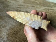 Made from beautiful Coastal Plains chert from Brier Creek! Nice chevron flaking pattern and a few crystal lined pockets! Serrated sharp, thanks for looking! |