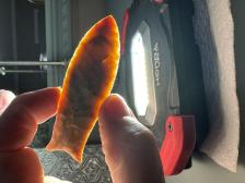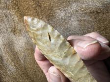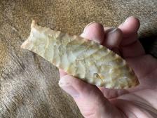 Made from beautiful Coastal Plains chert from Brier Creek! Serrated sharp with a nice chevron flaking pattern! Two crystal seams/pockets, a small one near the tip and a large one about an inch below the tip, hafting area is ground. Thanks for looking! |