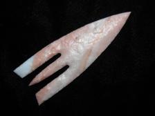 And now for something completely different. This is a Western European Bronze age point style called an Armorican point. They were made with deep notches from the base and a long pointed tang. Its made out of Flint ridge and is a bit more pinkish than the pics show. Not an easy point to make but sort of fun to do something different for a switch. |