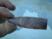 Hi,here is another very good pt from some darker,nicely patterned rock,very thin & good quality pt with good scar flakes.Much like a angostura styled pt/blade.thanx again ! Again,sorry about the pics,not good,not sure what happened,was near dark,...will try & get more tomm.,anysways,..very good pt.! |