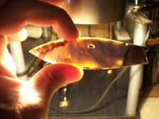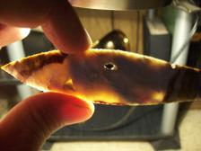 I Knapped this Agate basin style blade out of some Bullseye Jasper, Has a natural hole and other goodies mother nature created. look close at all pictures, i tried to get some closeups . and look at bottom a speck of the outside of the rock was fortunate enough to hold on. Cool piece. Thanks for your interest and have a safe day.Will combine shipping. |