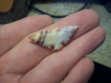 I Knapped this little bird out of some Creamy Bullseye Jasper from Nevada.Again I wont waiste material,this started out a point. Thanks for your continued interest and have a good day. Will combine shipping. |