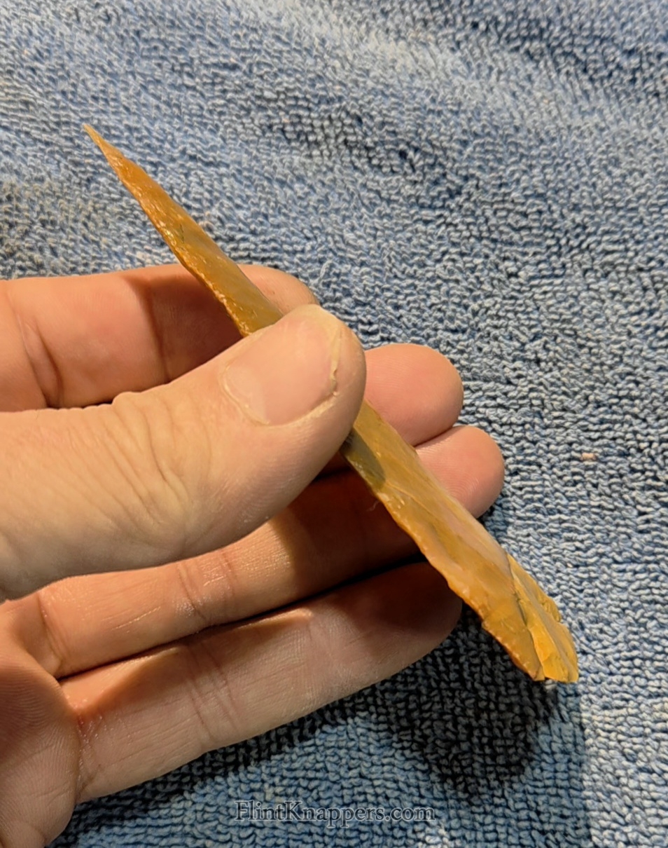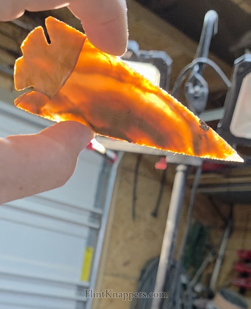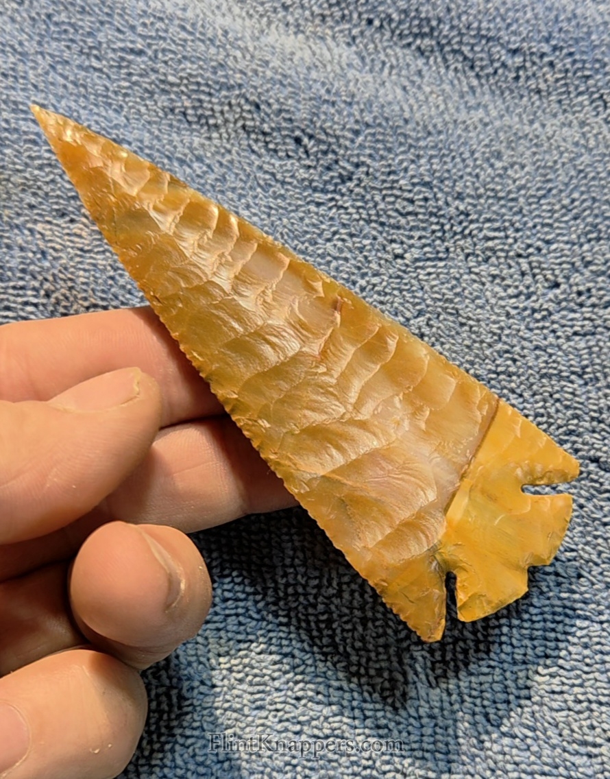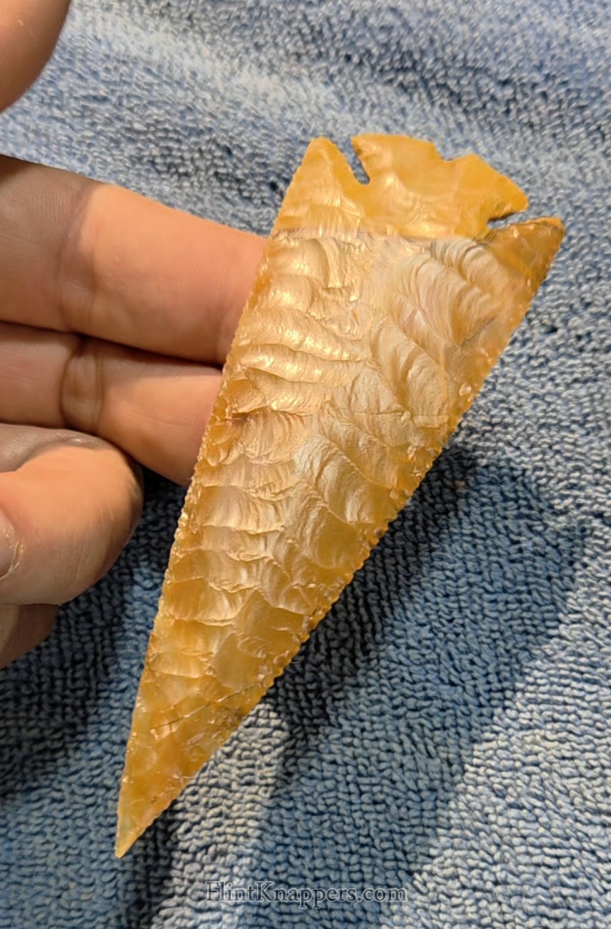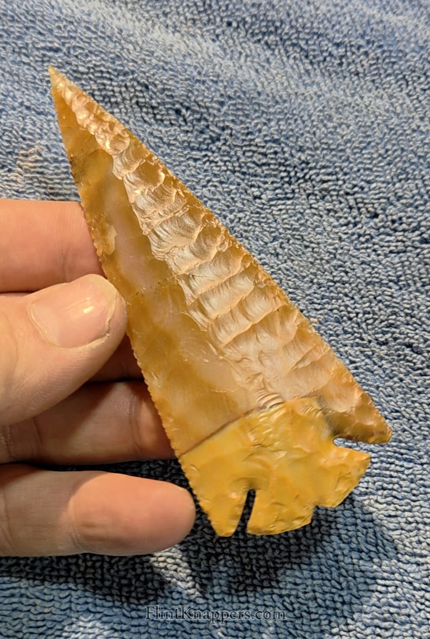 Here is some very unique Burns Green obsidian. I call it real tree camo Burns green. Super thin point with deep notches to boot. Thanks for viewing |
