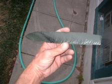 My first try @ a large flake over grind method blade,not quite as good as I wanted,but a pretty nice blade.Practice...... almost 10 inchs long,and 1 1/2 in wide. Thanx kindly ! |