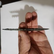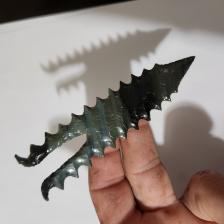 Beautiful burns green obsidian. Deep serrations. Deep base notch