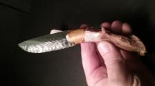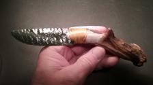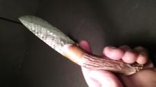 I made this knife with a rare peice of Striped Burns Green obsidian that I flaked to perfection (if you ask me...) it's super shap too... got the scar to prove it...lol. The handle is shed whitetail deer antler that i found to be very attractive and have nice brown color and lustre. The knife flows well with gold sinew wrap. It's 7 1/4 inches long.
