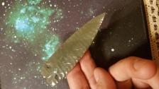 This burns green wintu has beautiful flake patterns and narrow entry notches. Burns green obsidian is no longer being excavated from the pits and will soon be very hard to find just like many other lithics that have come and gone..thanks for viewing.                       |