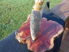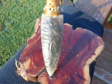 This knife has a cholla cactus wood handle with a black buffalo chert dovetail blade and comes with a cedar and antler stand. |