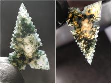 Great little Cahokia in a awesome piece of Green Moss Agate. Clean flaking, and well balanced. The green Moss in this piece is suspended in a less common golden tinted chalcedony, and it looks great if you ask me! Good spacing between the moss for light to come through as well. Green Moss reminds me of quartzite in ways when working it, but I sure like the end result a lot more. (Dont get me wrong though, quartzite can definitely be cool)