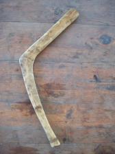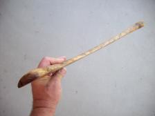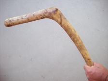 cut from the center of a single hardwood tree limb, this throwing stick is tough as well as balanced. minimal finish with burned in designs.