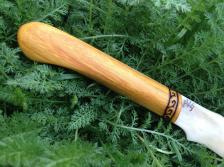 Made of a camel bone, with Canaraywood (Centrolobium spp) grips. I added a little flair with a burnt band around the front end of the grip, and as is my tradition, I adapted the maker's mark to the cultural background of the blade, and burned it in Elvish.