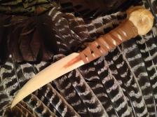 Hand made Camel bone Knife, with braintanned buckskin wrap on the handle. The pommel is the natural end of the bone, left mostly unmodified.