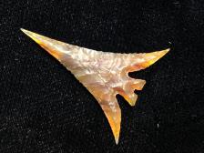 This little sweep wing Columbia style point is made from a piece of Brazilian agate. It has really pretty bands of coloration in the orange swirl of colors. I got to see some original points some time back that were this radically made. Long sweeping barbs. |