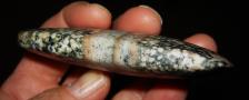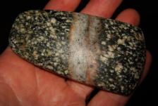 This celt is made out of porphyritic diorite with a vein of aplite running across it. The raw material is from northern Ontario, Canada. |