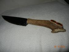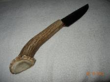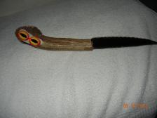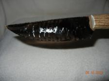 Obsidian blade with a stripe that runs from the tip to about 2/3 of the way back. Pretty Axis deer antler with burr and two eyes where brow tine was cut off. |