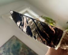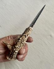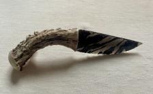 Here’s one from my keeper case. It’s a Cliff Carney obsidian blade that i hafted to a whitetail antler handle. It self displays nicely on the brow tine and fits the hand perfectly. The crack in the nicely shaped and buffed crown is inlaid with red coral. It’s a sweet piece and will fit nicely in any collection.