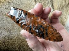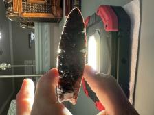 Made from a deeper colored mahogany obsidian with a few semi translucent spots! Serrated sharp, hafting area is ground. Thanks for looking! |