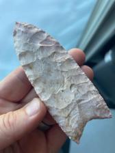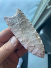 A beautiful, fluted Clovis. This point is made using a a high grade variety of speckled pink/orange Burlington. There are a number of crystal inclusions on this piece.