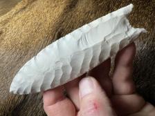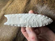 Made from Keokuk chert from Oklahoma. Serrated sharp with a nice chevron flaking pattern! Hafting area is heavily ground, thanks for looking! |