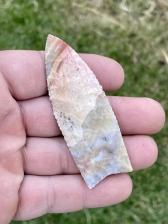 A beautiful flint ridge Clovis! One flute is over 3/4 of the point and the other a little over 1/4 |