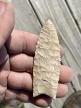 Raw Buffalo chert made into an excellent Clovis. One side was percussioned off the other was with a jig. Gives 2 different display options. |