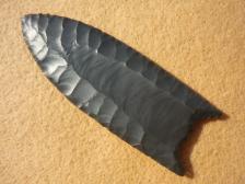 A nice, small Clovis, with flutes the same length on both sides. It is made of James River Black, which is found near Fredericksburg, Texas. Knapped by one of Texas’ better knappers, Jerry Bridwell. Knapped Mar, 2000. Signed J Bridwell. |