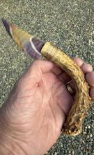 What a great Mookaite blade hafted to an usual curved Virginia "yellow" antler.....I'm wondering what type of flora the buck was rubbing on......never seen one this yellow.