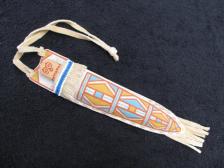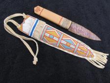 Ok, so this is what I've been working on for a number of days. This is a Columbia River/Plateau style neck knife. The blade is made out of Oregon Sunset jasper and is pitch glued into a carved wooden handle of Pacific Yew and lashed with two ply nettle cord like on an original old one I saw. It has distinct mid Columbia decorations and motifs carved into it and is filled with red ochre. The knife itself is 9 1 1/2" long. The sheath is rawhide and is folded over and sewn with two ply elk sinew cordage. It has brain tan fringe on the bottom and top with several rows of blue and white pony beads. The paints are all native earth pigments painted on parfleche style typical of the Columbia plateau. The knife inside sheath is about a foot in length. Obviously not something I make every day. |