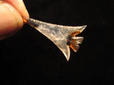 And one more Columbia River style point for the day. This one is made in the usual classic shape and is made of clear Montana agate with some dark tinged with orange in it. Many of these points were notched in the base probably to help thin it for hafting. |