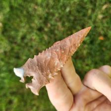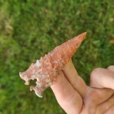 Small eccentric arrowhead made from a unique piece of coral. This piece does have a few finger nail hinges but has great color and a unique design.