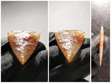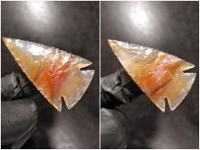 Nice Corner Notch point in an epic piece of Brazilian Agate. Clean flaking, regular surface, well balanced and mighty sharp. This piece of Brazilian is epic, with a lot of features, including some awesome crystalization on one face, and beautiful color. It came from the same host rock as the large Agate Basin that I recently posted.