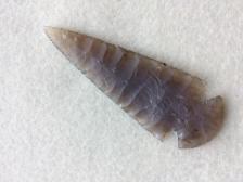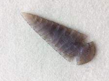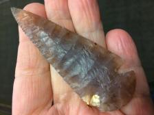 A nice translucent, Texas agatized wood, corner notch with a fan base. It was knapped by excellent Texas flint knapper, Virgil Tonn. The point is a translucent tan and brown, embedded with original plant structures in a brown hue. Knapped March, 2001. Signed: VT |