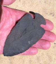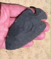 Grainier form of the Sommerset black I dig this Dove was a bear to chip with bone but I like it. Chipped with antler and bone notched with Buffalo rib bone and the base is ground and looks old nice percussion scars and edge work.