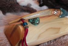 This is a whitetail deer antler tine knife – flamed & aged for a relic effect. The blade is a green jade agate – contemporary arrow point. The knife sits proud atop the cedar wood stand, with it’s carved coyote paw track. A turquoise nugget holds this skinner in place. A soft deerskin lanyard & beads rounds out the piece. A very nice traditional style. (Knife is 8 ¼” long). $9.00 shipping & insurance. |