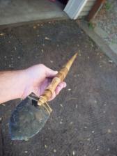 large dacite head hafted onto a hardwood foreshaft with pine pitch glue, sinew, and rawhide and socketed into a rawhide reinforced mainshaft of oiled douglas fir. overall length is 7', but the foreshaft is removable for easy shipping. |