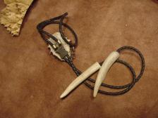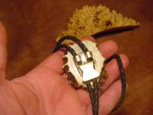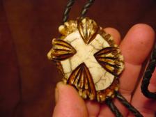 Offered here is a very beautiful carved elk antler bola tie, the antler was a older and had some cracking but after I carved it and stableized it ,it made it look like marble, I used a locking bola clasp on the back , The cord is greek braided leather capped of with 2 antler tines. perfect for the person who has faith and Believes in Jesus . Signed bonecarver and numbered. |
