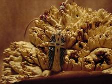 Her eis a beautiful cross carved from a slice of 10,000 year old mammoth tusk, the color patina is natural , I inked the ivory to bring out detail.