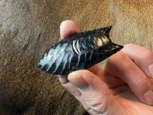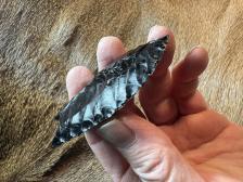 Nicely flaked Crowfield made from Black Butter Obsidian. Crowfield points as artifacts are rare finds. This one was made after one found in Chautuaqua County, New York. Hafting area is ground, serrated sharp. Thanks for looking! |