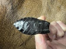 Made from Black Butter obsidian. Made to resemble one found in Chautuaqua County, New York. Serrated sharp, hafting area is ground. Thanks for looking! |