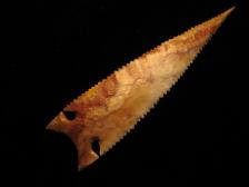 This nice Crump Lake style Northern side notch is made from a piece of Bullseye jasper. It has nice expanding narrow entry notches and a sleek tip with serrated edges. This material looks like someone partially mixed reddish brown chocolate sauce into pancake batter. Sry...the only metaphor I could come up with. |