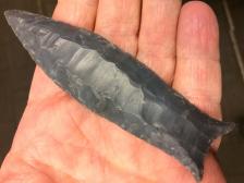 A nice Hornstone Cumberland replica by Jeff Gower. It was knapped from gray Indiana Hornstone. Jeff is one of the best commercial flint knappers in the U.S. Knapped Aug, 1998 |